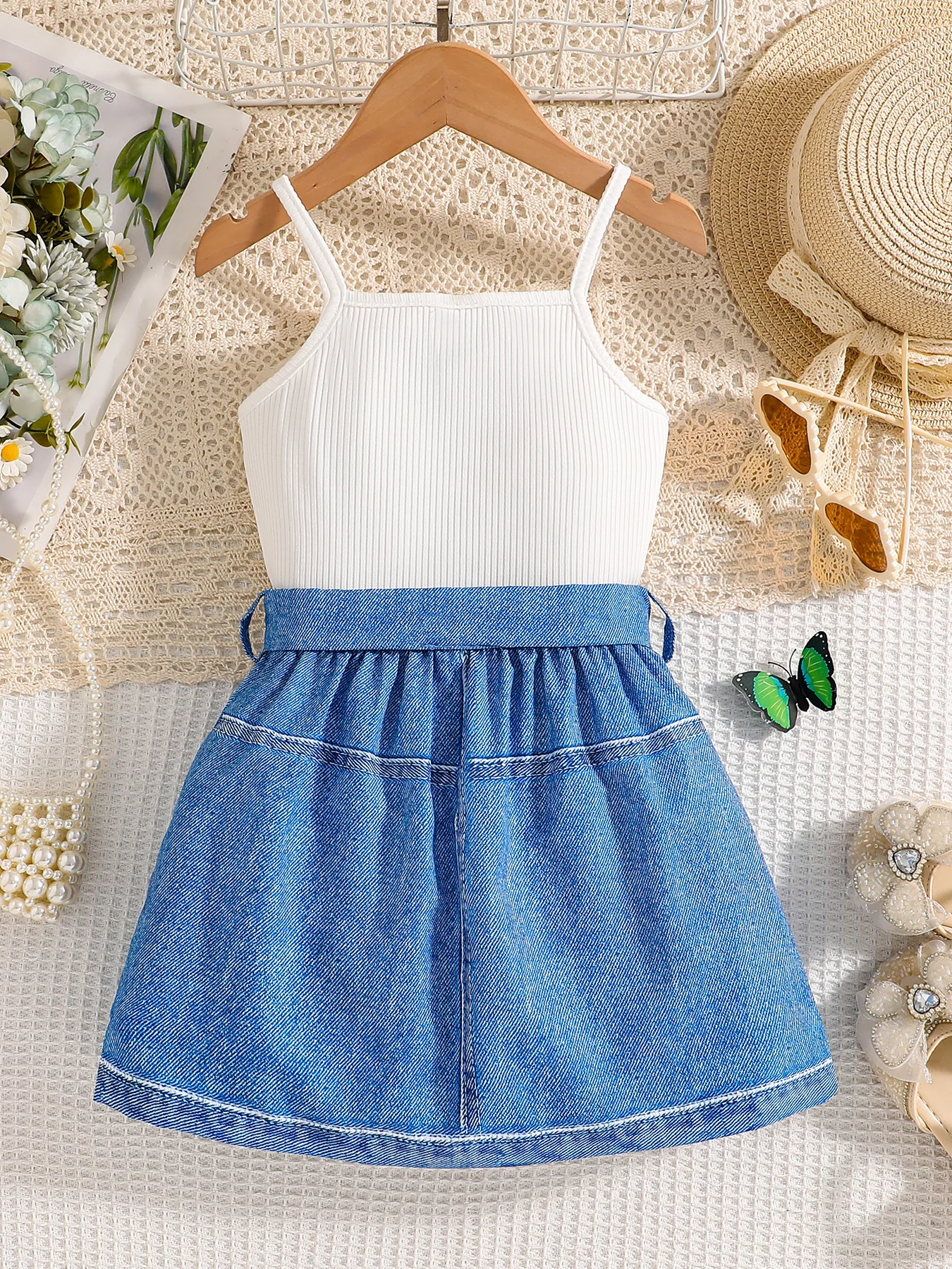 Conjunto Casual de Verano para Niñas (2 Piezas) – Top Mariposa y Falda de Denim Elástico